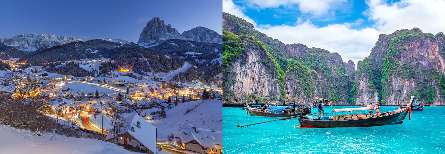 Northern Hemisphere destinations offer peak winter charm—Christmas lights, alpine skiing, frozen lakes—while tropical destinations like Thailand, Vietnam, and Mexico enter their dry, sunny season.