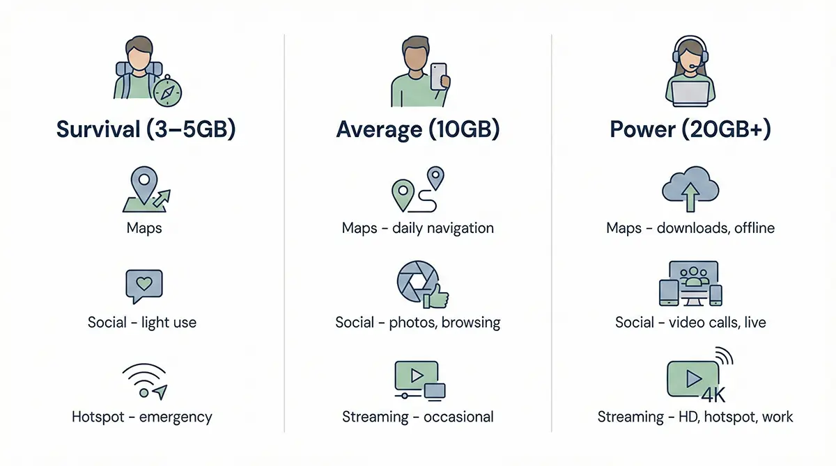Người dùng "Sinh tồn" (3-5 GB): Bạn chỉ sử dụng dữ liệu cho Google Maps, ứng dụng dịch thuật, và tin nhắn WhatsApp. Bạn sử dụng WiFi khách sạn cho mọi thứ khác.