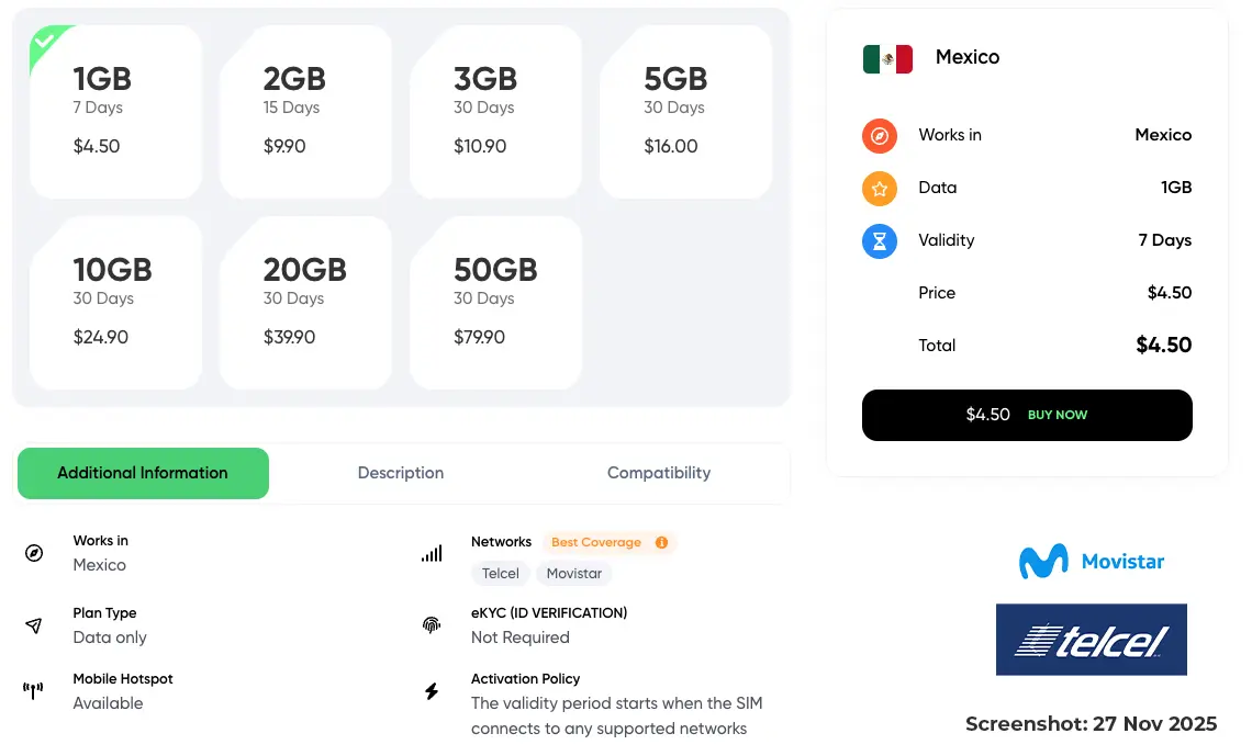 | Airalo | 3 GB / 7 días – $10.50 | 5 GB / 30 días – $16.00 | 10 GB / 30 días – $23.00 | Generalmente basado en Movistar según pruebas recientes de viajeros; Telcel no garantizado. |