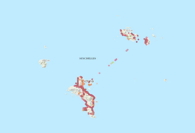 Coverage across Mahé, Praslin, La Digue, and most resort islands
