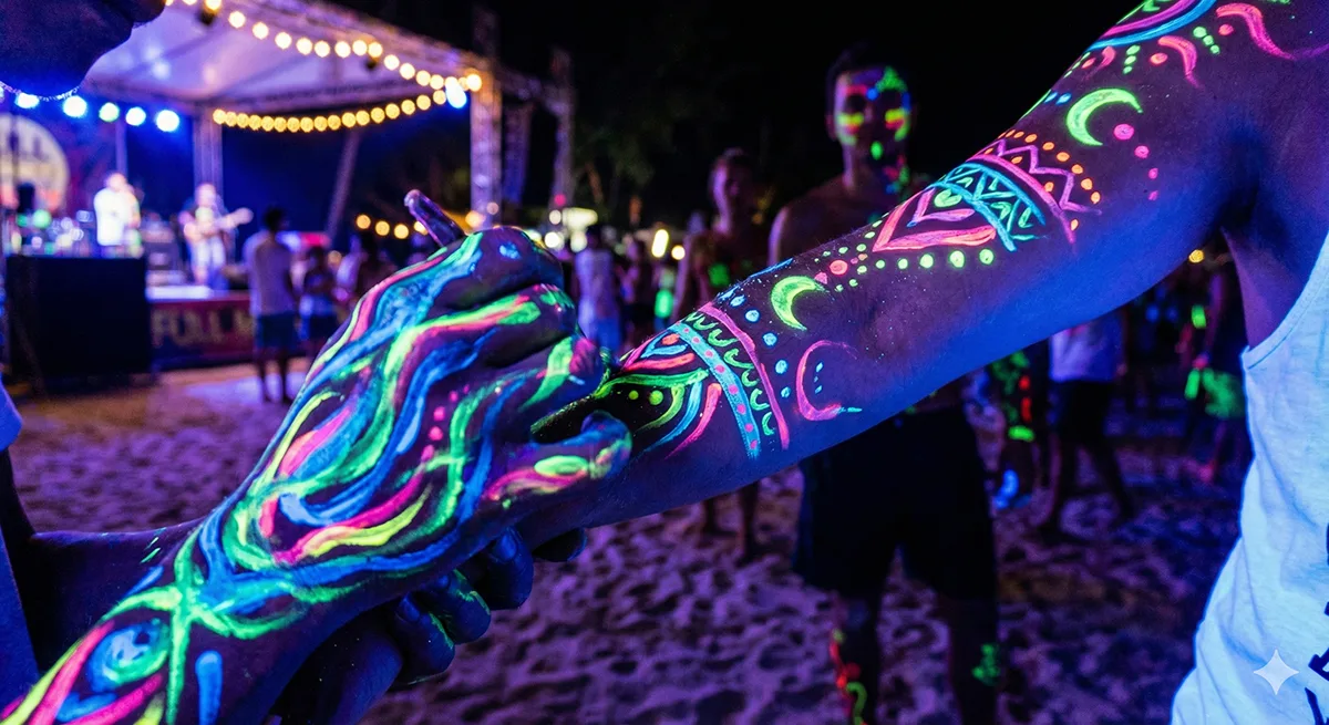 Neon body paint is one of the most recognizable elements of the Full Moon Party festival. UV-reactive designs shine under blacklights and create a glowing atmosphere.