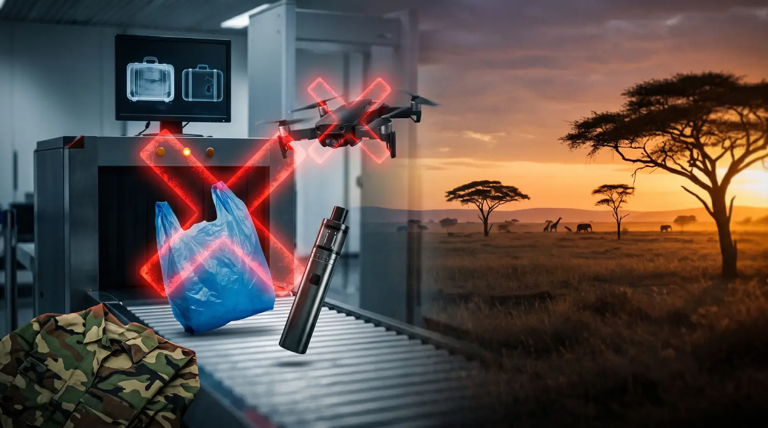 Even if you make it past the airport, entering protected areas requires absolute compliance with the 2020 Single-Use Plastic Ban. If you are heading on safari, you are strictly forbidden from bringing plastic water bottles, disposable plates, plastic straws, or sweet wrappers into any National Park. For a detailed breakdown of what you can and cannot bring through the terminal, review our guide on Kenya Airport Customs Rules: Allowances & Plastic Ban.