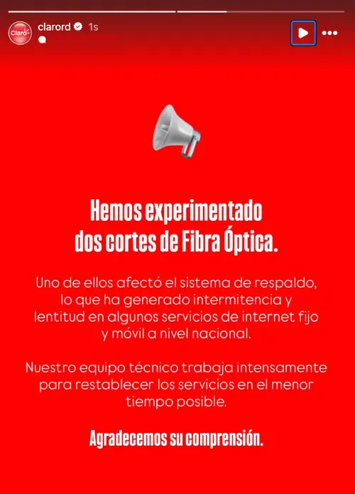 Claro ha confirmado oficialmente que el incidente fue causado por dos cortes de fibra óptica separados, uno de los cuales afectó el sistema de respaldo del operador — resultando en velocidades lentas a nivel nacional, conectividad intermitente y inestabilidad en el servicio.
