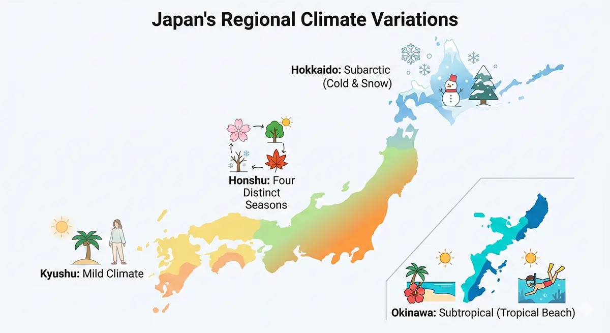 Il Giappone si estende su una lunga latitudine da nord a sud, il che crea una drammatica variazione climatica. Tokyo, Kyoto e Osaka seguono un modello temperato a quattro stagioni, mentre Hokkaido vive inverni lunghi e nevosi e Okinawa gode di un clima subtropicale.