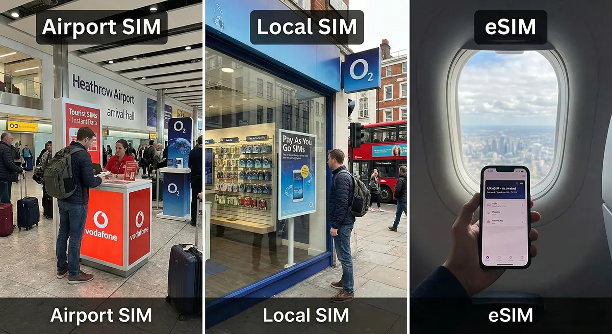 Denna guide bryter ner varje realistiskt sätt att få internetåtkomst i Storbritannien, inklusive SIM-kort på flygplatsen, lokala förbetalda alternativ och moderna eSIM-lösningar. Du kommer att hitta aktuella priser, täckningsinsikter och praktiska tips för att hjälpa dig att avgöra vilket alternativ som passar din rese stil, längd på vistelsen och databehov bäst.
