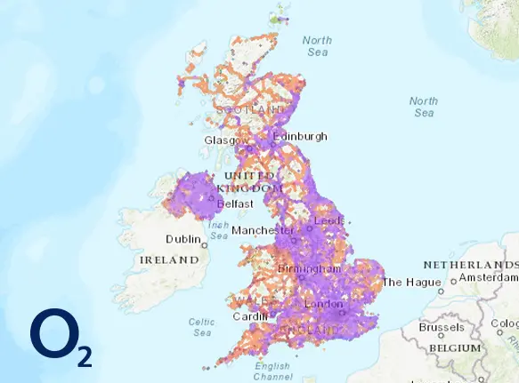 O2 erbjuder stabil och konsekvent täckning över hela Storbritannien, med bra inomhussignalprestanda. Det används vanligtvis i bostadsområden och mindre städer, vilket gör det till ett pålitligt alternativ för vardaglig uppkoppling, även om topphastigheter kan vara lägre än EE på vissa platser.
