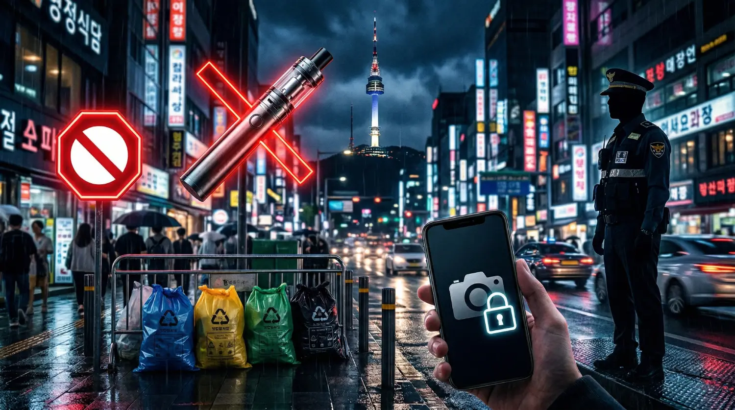 คุณไม่สามารถใช้บุหรี่ไฟฟ้าในขณะที่เดินไปตามถนน เดินเล่นในสวนสาธารณะ หรือรออยู่ข้างนอกทางออกของรถไฟใต้ดินได้เลย การใช้บุหรี่ไฟฟ้าเป็นสิ่งที่ถูกกฎหมายเฉพาะใน "พื้นที่สูบบุหรี่ที่กำหนด" ที่มีการติดป้ายชัดเจน หากคุณใช้บุหรี่ไฟฟ้าในเขตห้ามสูบ คุณจะถูกปรับทันที ₩100,000 และอย่าลืมว่า "ช่างภาพสูบบุหรี่" (คนท้องถิ่นที่ได้รับค่าจ้างเพื่อรายงานผู้ละเมิด) กำลังเฝ้าดูอยู่เสมอ นอกจากนี้ หากคุณนำของเหลวบรรจุบุหรี่ไฟฟ้าเข้าประเทศ ให้รักษาให้ต่ำกว่าขีดจำกัดศุลกากร (ปัจจุบันคือ 20ml ของของเหลวบรรจุบุหรี่ไฟฟ้า); หากเกินกว่านั้นจะต้องเสียภาษีหนักหรือถูกยึดที่สนามบิน
