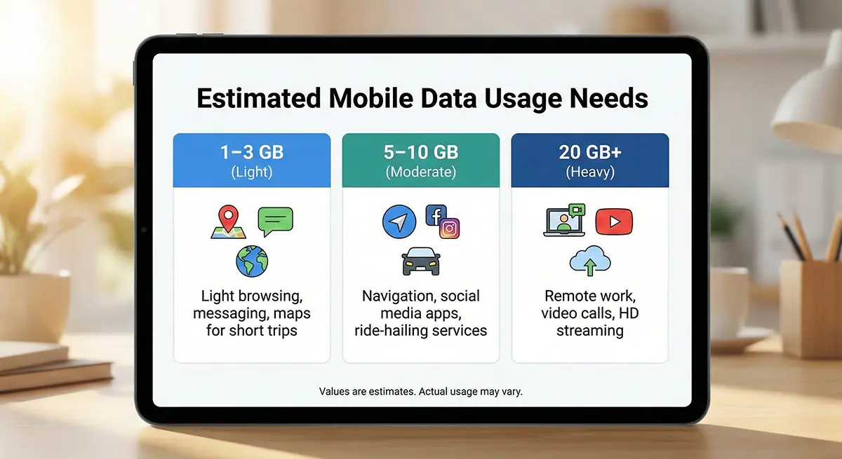 • 5–10 GB: 导航、社交媒体、打车